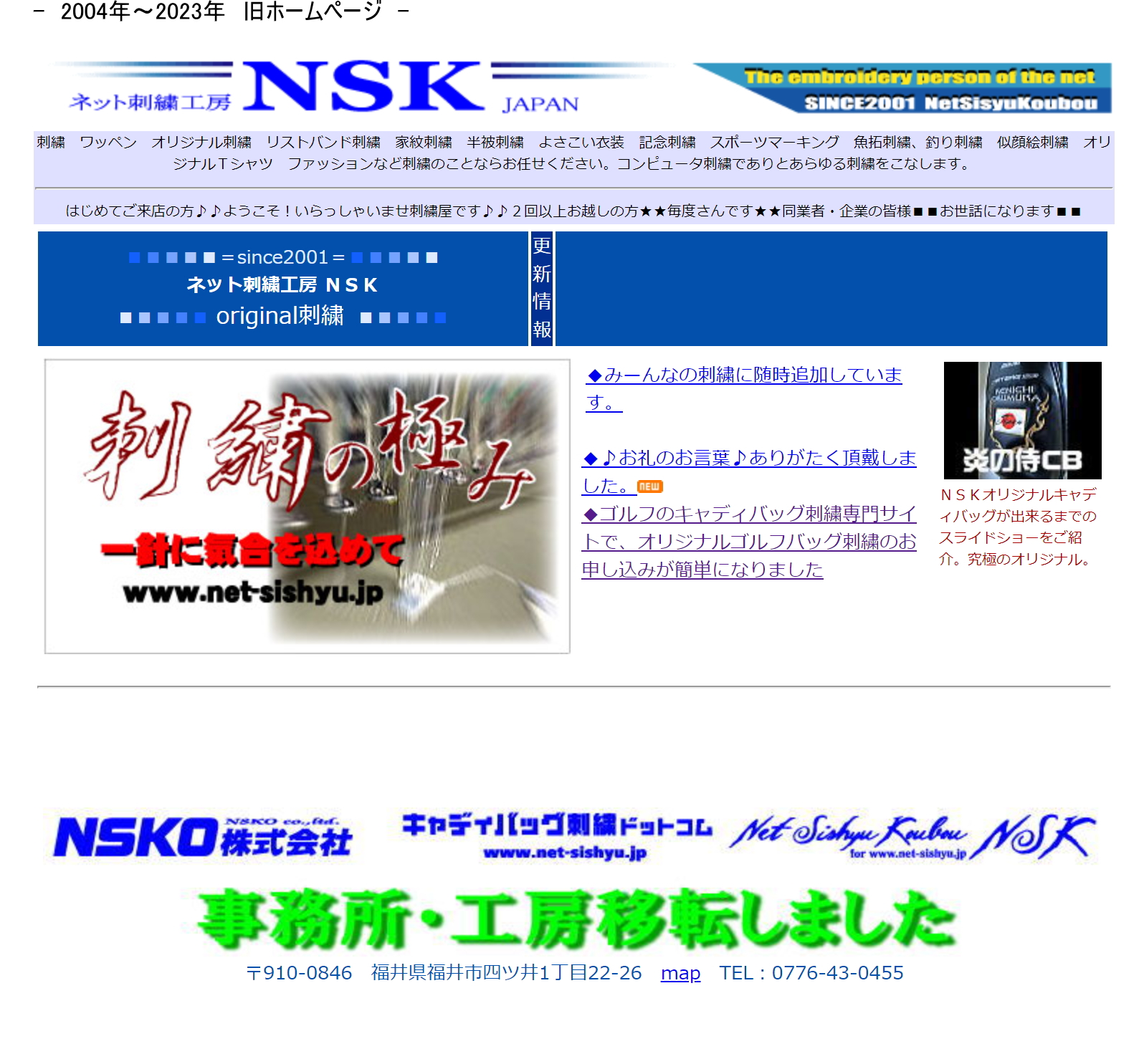| 2004年から1日も休まず営業してくれた、旧ネット刺繡工房NSKのホームページをリニューアルしました。 20年間お疲れさまでした。 当時は掲示板に毎日書き込みして、生きたホームページを活用するんだと意気込んだ記憶が懐かしいです。 軽くてサクサク早いホームページじゃないと駄目って言っていましたね~ 今じゃ大きな画像を何枚も載せてもいいし、綺麗な動画も載せてもいいんです。 時代は変わっていきます。 |